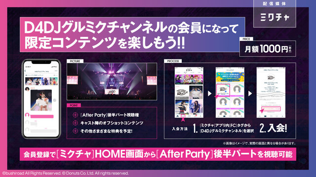 さらに入会者には毎月会員費相当のミクチャ内で使えるアプリ内コイン(1,000コイン)が付与。ポイントは「MixChannel Presents D4DJ CONNECT LIVE」視聴中に、限定Tシャツを獲得できる指定アイテム(4,000コイン)の投稿にも利用可能だ。
