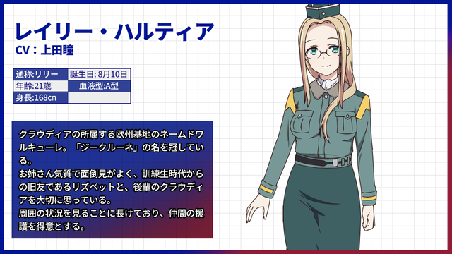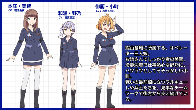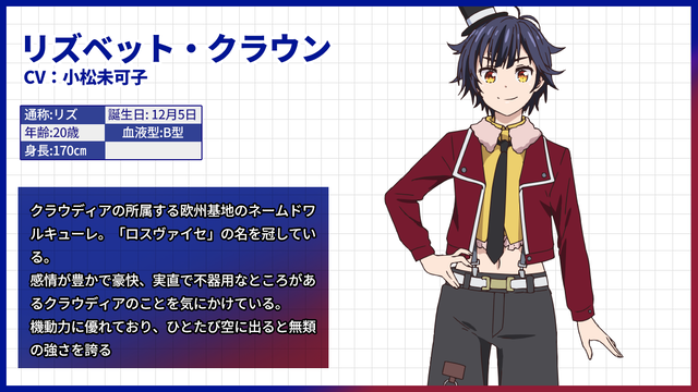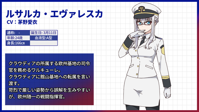 さらに6名の追加キャラクター情報が解禁。ノベル版の主人公でもあるルサルカ・エヴァレスカを茅野愛衣、クラウとともに欧州戦線で活躍していたリズベット・クラウンを小松未可子、レイリー・ハルティアを上田瞳が演じることが決定。さらに、館山基地のオペレーター3人組の本庄・美智、和浦・野乃、御厨・小町はそれぞれ堀江由衣、日高里菜、上坂すみれが演じることが発表された。