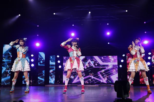 ライブ後半戦では黒一点のWITHが登場。「Giraギャラティック・タイトロープ」・「スーパー・ダーリン」で男プリならではの力強い歌唱でギャラクシーなステージを魅せます。Gaarmageddonの「神曲!~GaarmageTourism~」・NonSugarの「シュガーレス×フレンド」・MY♡DREAMのゆい(伊達朱里紗)、みちる(山田唯菜)による「Believe My DREAM!」とプリパラの名曲たちが次々と繰り出され、「ラン♪for ジャンピン!」ではDressingPaféが間奏中に“ドレパ”にちなんだあいうえお作文を即興で披露。“どんなときでも・列車は続くから・信じてついてこい!”と3人で言葉をつなぎ、ライブの盛り上がりは最高潮に。満を期してSoLaMi♡SMILEの3人が顔を揃え「HAPPYぱLUCKY」を満面の笑顔で歌い切ると、ライブはいよいよ終幕へ。