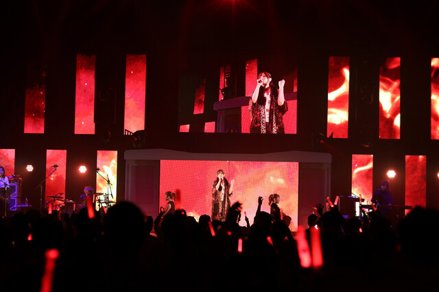 再度の衣装チェンジで白いドレスをまとって登場した鬼頭は、そのイメージにぴったりと合う幻想的な曲と映像で魅了していき、星の瞬きを表現したかのようなストリングスが心地良い「Star Arc」で観客を別世界へと誘う。