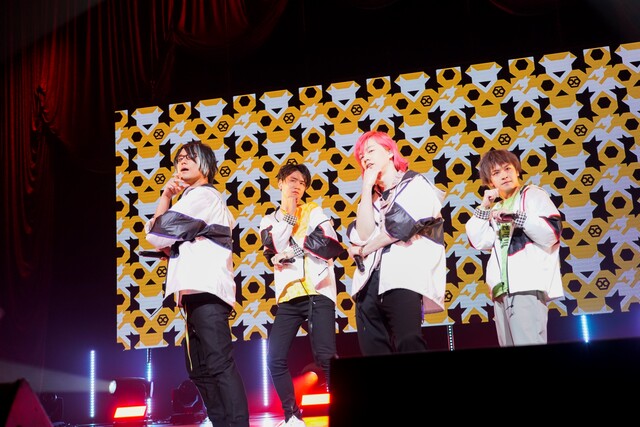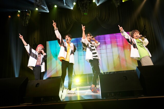 作中キャラクター衣装と近しい雰囲気の白と黒を基調にした衣装に身を包み、エモーショナルな曲調に合わせて自由に飛び回る4人。サビの部分では思わずタオルを回したくなるほど、1曲目から会場を盛り上げていました。さすが、“ファンと一緒に盛り上がるライブ感に特化したグループ”!