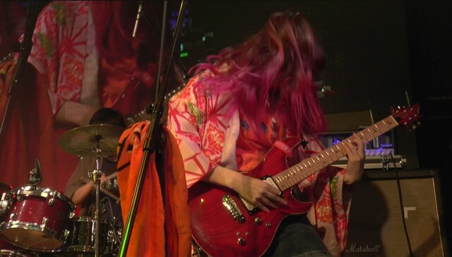 太田エリカ様のギターが唸りを上げる。ここで披露したのが、インストナンバーの「Sky-雲外蒼天-」。太田彩華も、ここではベース演奏に専念。大空を勇壮に駆けめぐるギターの音色をしっかりと支えていた。太田たけちゃんの熱い煽り声に触発され、フロアでも数多くの拳が天高く突き上がっていた。途中で転調し、高揚したドラマを作り上げる姿も、とても華やかだ。