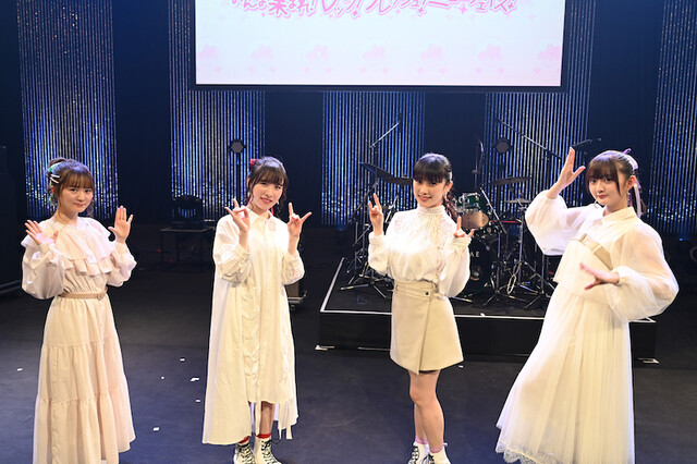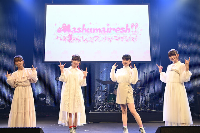 開演前の影ナレでは、Mashumairesh!!のメンバーが、感染拡大防止ガイドラインをふまえたライブの注意事項をしっかりと読み上げていく。その中で、「ショウバイロッカーさん(=ファン)と一緒のイベントとしては、2019年11月24日に開催した『3969 GRATEFUL ROCK FESTIVAL』以来」という言葉もあったが、Mashumairesh!!にとって、約1年ぶりの有観客でのイベントとなる。それだけに、ステージに登場したMashumairesh!!のほわん役の遠野ひかる、マシマヒメコ役の夏吉ゆうこ、デルミン役の和多田美咲、ルフユ役の山根綺の表情は、会えた喜びにあふれていた。そして、オープニングのフリートークでは、さっそく1月からスタートしたTVアニメ『SHOW BY ROCK!! STARS!!』の話題に。1話からMashumairesh!!が収監されるという衝撃展開だったのだが、そのことを楽しそうに話していたのが微笑ましかった。