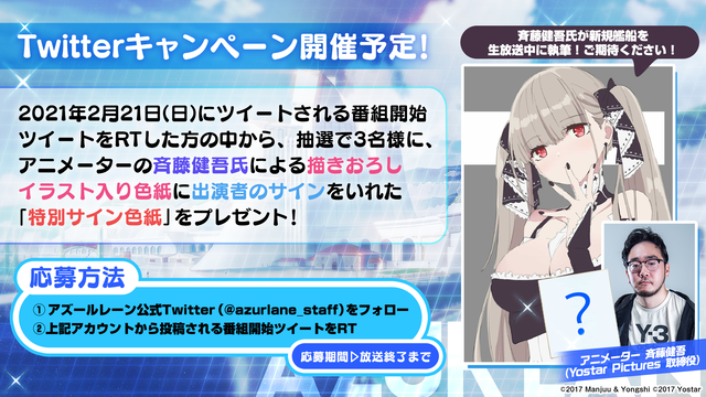 配信と同時開催。アニメーターの斉藤健吾(Yostar Pictures取締役)による描きおろしイラスト入り色紙に出演者のサインをいれた「特別サイン色紙」を抽選で3名にプレゼント。描き下ろしイラストは生放送中にLiveで書いていただきます。