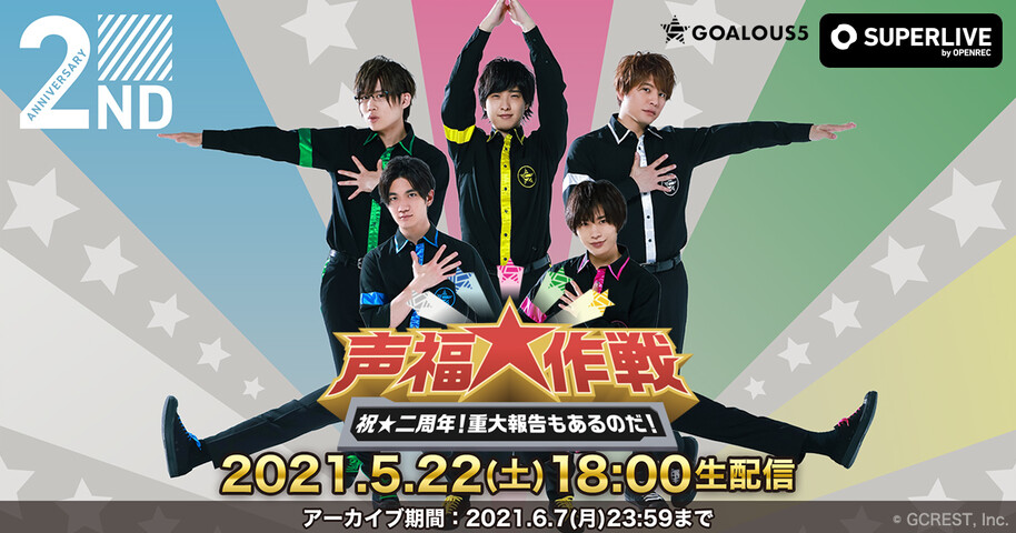 株式会社CyberZ(本社:東京都渋谷区、代表取締役社長:山内隆裕)が提供する動画配信プラットフォーム「OPENREC.tv」(オープンレックティービー)の「SUPERLIVE by OPENREC」は、2021年5月22日(土)に株式会社ジークレストが提供する男性声優5人組グループ「GOALOUS5」の「声福大作戦〜祝★二周年!重大報告もあるのだ!〜」を生配信する。
