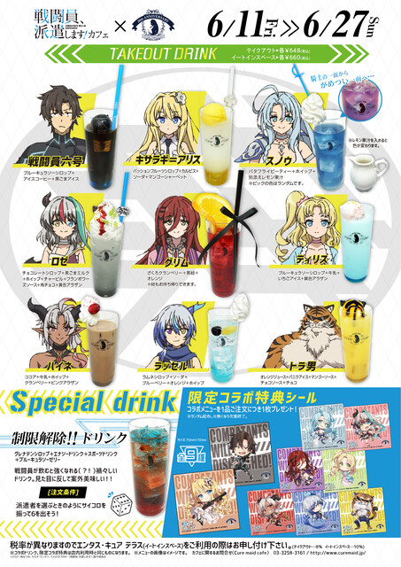 場面写真の展示など「戦闘員、派遣します!」の世界観に浸れる店内で、六号やアリスたちをイメージしたドリンクやフード、スイーツを提供。さらにコラボメニューの注文で限定特典をプレゼント。
