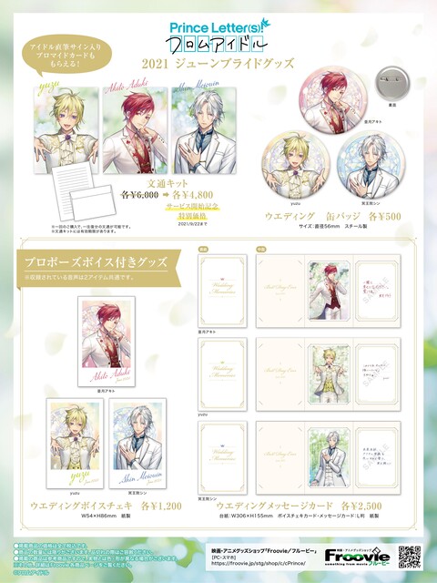 今回発売になる公式グッズはウエディング缶バッジ、ウエディングボイスチェキ、ウエディングメッセージカードの3種類。ウエディングメッセージカードにはアイドルたちが書いた一言が添えてある。そしてウエディングボイスチェキとウエディングメッセージカードの裏面にはQRコードがついており、これを読み取ると彼らが考えた『理想のプロポーズ』を聴くことができるようになっている。さらに、彼らと直筆のお手紙のやり取りができる専用の文通キットも今月に限り、タキシード姿のビジュアルを使用した特別ver.になっている。どちらも数量限定の販売になっているので見逃すな。