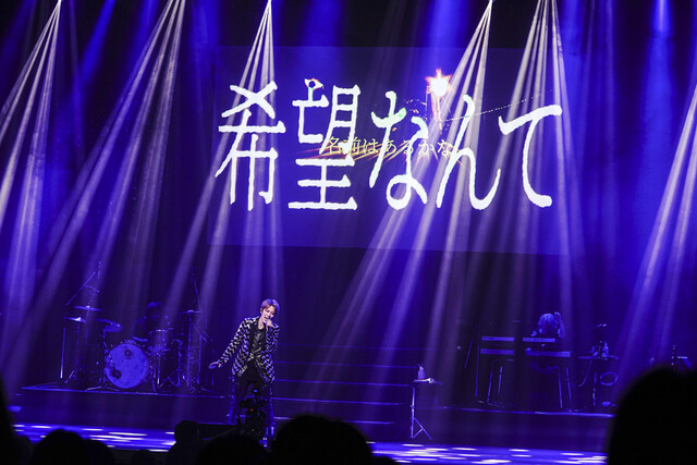 汗がひいたところで続いては、リリックビデオをバックに、憧れの人への切ない想いを語りかけるように歌った「ポラリス」、想いをストレートに綴り、"愛している"という言葉に再び胸を撃ち抜かれたアコースティックアレンジの「愛し君へ」の2曲を歌唱。優しくも熱い、曲の世界観に酔いしれていると、気づけば本編ラストのパートに。