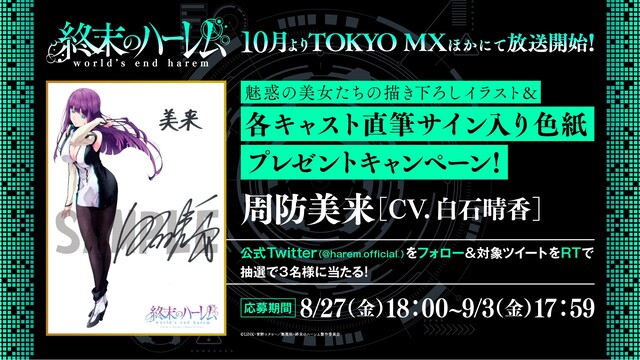 “ハーレム体験”バイノーラルボイスドラマの公開を記念して、キャスト直筆サイン入り色紙が当たるプレゼントキャンペーンが開催決定。TVアニメ『終末のハーレム』公式Twitterをフォロー&ボイスドラマ公開ツイートをRTで、豪華キャスト陣の直筆サイン入り色紙が手に入るチャンス。