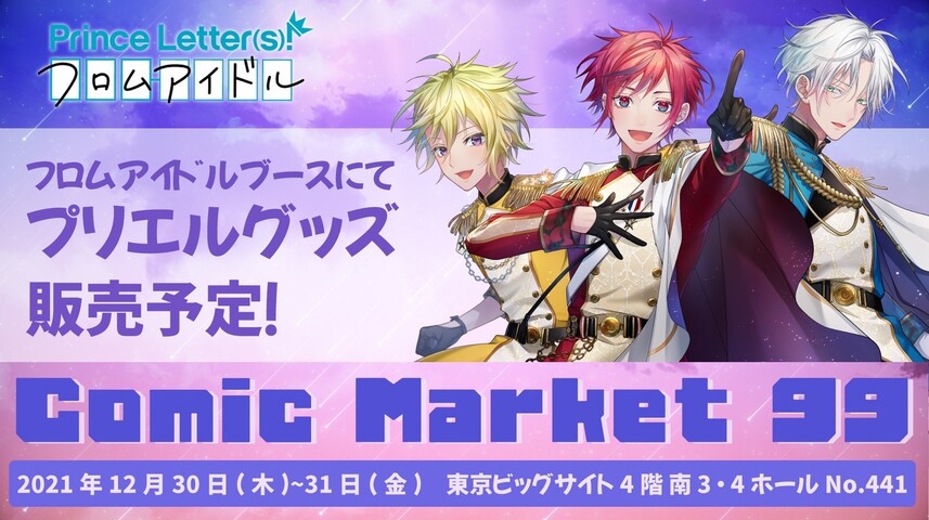 2021年12月30日、31日の2日間に渡って行われるコミックマーケット99に、『Princess Letter(s)!フロムアイドル』と合わせて『フロムアイドル』として出展することが決定。今回2年ぶりに東京ビックサイトにて実施されるコミックマーケット99。フロムアイドルは東京ビックサイト4階 南3・4ホールのNo.441にブースを構える。