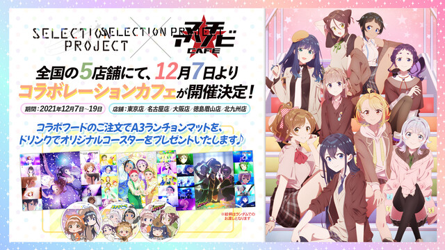 2021年12月7日(火)~12月19日(日)、マチアソビカフェ全国5店舗でコラボカフェ開催。オリジナルコラボカフェメニュー注文でオリジナルランチョンマット&コースターがプレゼントされる。詳しくはコチラ