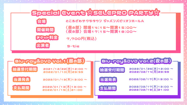 またBlu-ray&DVD Vol.1購入者を対象に「Special Event ☆SELEPROPARTY☆」昼の部のイベントチケット優先販売抽選受付を、Vol.2購入者対象に夜の部のイベントチケット優先販売抽選受付を、それぞれ実施。詳細はコチラ。