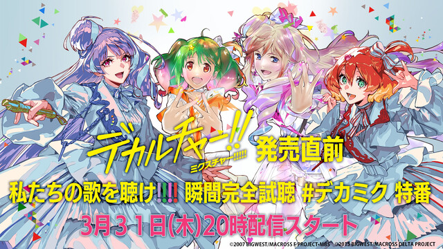 更に、超時空コラボアルバム「デカルチャー!!ミクスチャー!!!!!」の発売を直前に控える中、3月31日(金)20時より生配信特番の実施が決定した。この生配信特番には『マクロスF』よりMay’n、中島 愛、『マクロスΔ』よりJUNNA、鈴木みのりが出演。楽曲試聴のほか、歌姫たちの“超時空コラボ”トークも楽しめるスペシャルな番組となっており、特番ではコラボアルバム以外のデカルチャーな発表も?