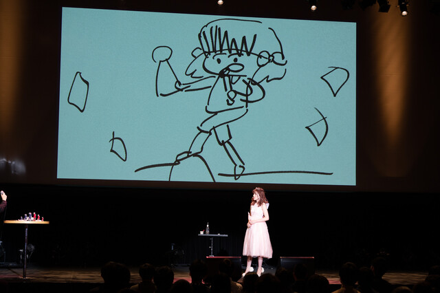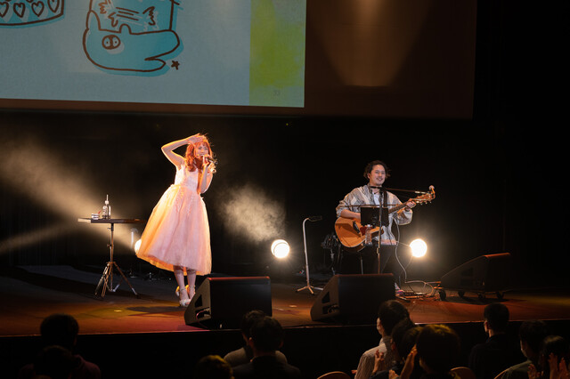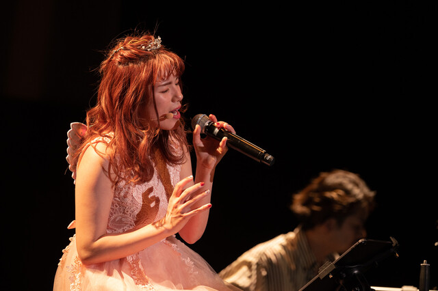 「アコースティックギターとやると決まったときに、アニメタイアップ曲以外にもギター映えのする曲がいいなと思って選ばせてもらいました」とセットリストも、この日のために考えて用意したことを伝える。意外な選曲もあり、会場のファンも楽しんでいるようだった。最後に最新曲「ENISHI」をアコースティックアレンジで歌い、たっぷりのライブコーナーを終えた。