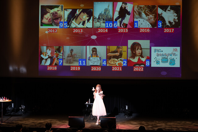イベントはまず「まちこ並べ替えクイズ」コーナーへ。髪型や髪の色、メイクがコロコロ変わるMachicoだが、アーティストデビューした2012年から2022年までの各年の自分の写真11枚を年代順に並べることができるのか!という問題。それを会場のお客さんと配信のお客さんの意見も参考にしながら並び替えていくのだが、自分の写真なので、部屋の写真やメイクの傾向からほぼ当てていたのはさすがだった。