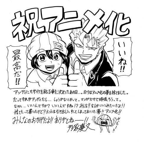 アンディにモザイクを貼る事を決めたあの日...。ボクはアニメ化の夢を捨てました。だってそれがアンディだし...しょうがないかって。マンガだけで頑張ろうって。なのに...いいんですか?いいんですね!?みんな!!なんかいいみたいだよ!!捨てたって書いたけど!!ホントは引き出しにずっとしまっておいた夢!!アニメ化!!
