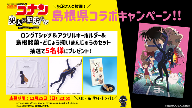 12月6日正午より、『名探偵コナン 犯人の犯沢さん』と島根県とのコラボキャンペーンがスタート。『名探偵コナン 犯人の犯沢さん』のグッズ(ロングTシャツ、アクリルキーホルダー)と、第10話で犯沢さんの母がお土産に持ってきた島根銘菓・どじょう掬いまんじゅうのセットが抽選で5名に当たるプレゼントキャンペーンとなっている。『名探偵コナン 犯人の犯沢さん』の公式Twitterをフォローし、該当ツイートをリツイートすると応募が完了。応募期限は12月25日(日)23:59まで。