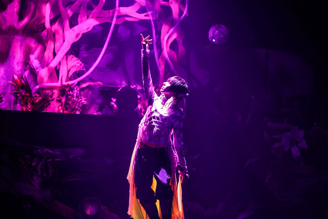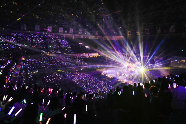 ダンサーコーナーを挟んだ7曲目の「哀唄」では、シースルーのガウンと髪飾りを付けたスタイルに衣装替えし、巨大ツリーの上に登場。優雅かつ艶やかな振り付けも披露しファンの視線を釘付けに。両国国技館の観客席はアリーナを取り囲む形で高い位置にも設置されていたが、感謝を伝えたいという蒼井の姿が観客ひとりひとりの目により届く演出となった。