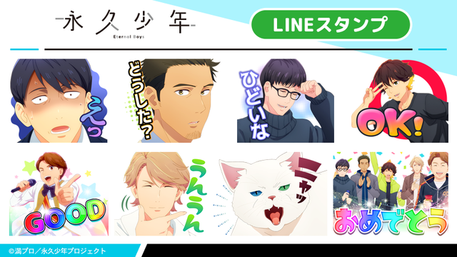 2月20日(月)より『永久少年 Eternal Boys』のLINEスタンプの販売が開始。個性溢れるおっさんアイドルたちのスタンプを使って会話を盛り上げよう。