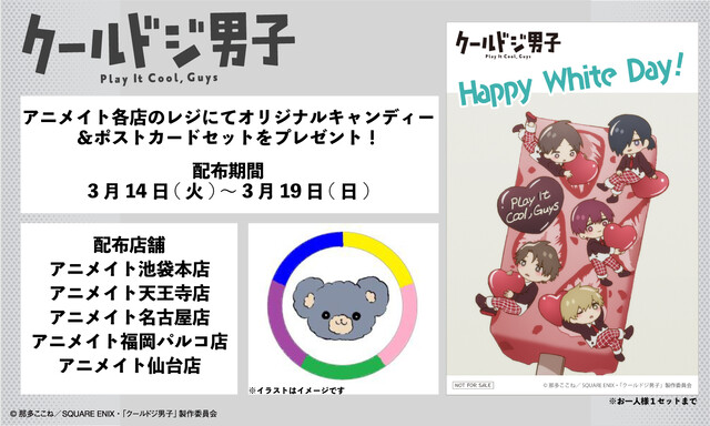 さらに、クールドジ男子たちからの“ホワイトデーのお返し”として 3月14日~3月19日の間アニメイト各店にて『クールドジ男子』オリジナルキャンディー&ポストカードセットをレジにてプレゼント。きっとクールに決まるはず…なホワイトデーのお返しをぜひ受け取ろう。