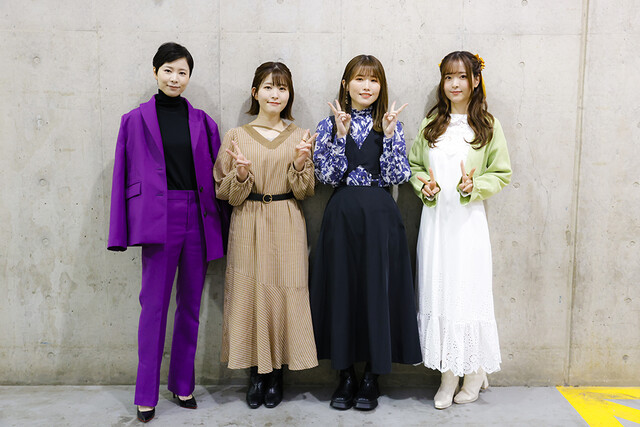 登壇者は、鳳ここな役の石見舞菜香さん、静香役の長谷川育美さん、カトリナ・グリーベル役の天城サリーさん、そして柊望有役の森なな子さん。ステージの開幕と共に司会の森さんが登場し、大きな拍手の中、石見さん、長谷川さん、天城さんを呼び込みます。それぞれが挨拶をすませると、森さんから作品についての説明が行われました。
