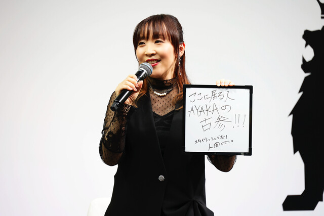 atsukoが「ここに居る人は『AYAKA ‐あやか‐』の古参!」と言うと、KATSUは「そうね!」とうなずき、客席から自然と拍手が起こった。続けて「『AYAKA ‐あやか‐』はスタイリッシュであり、人間臭くもある。あとオリジナルアニメは、誰も原作を知らない。毎週ちゃんと見ないと、次どうなるかが分からない。皆さんと楽しく見ていく、というのがあやかいポイントなのでは」と力強くアピールしました。