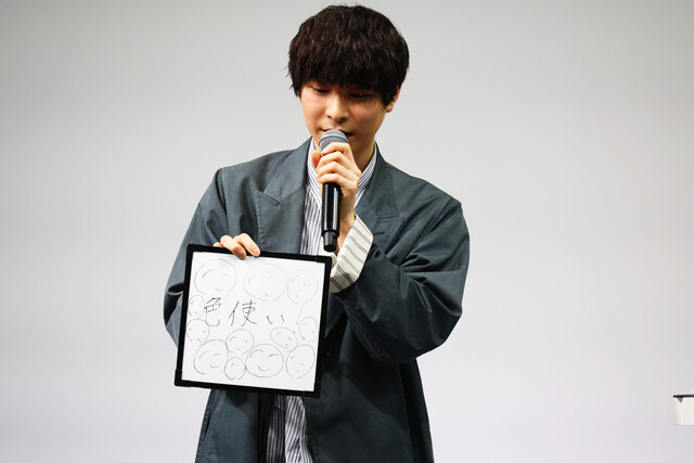 最後に上村は「色使い」をポイントに挙げ、本作のキーワードにもなっている「ミタマ」の絵をフリップいっぱいに描いて披露。「キャラクターそれぞれの色使いがとても綺麗。幸人としては、水に関わっているキャラクター。水の描き方がとても綺麗。自然豊かな綾ヵ島の魅力が存分に詰まった作品になっている。それぞれの彩りが、作品をどういう風に彩っていくのか、楽しみにしてもらえれば」と語り、イベントは幕を閉じました。