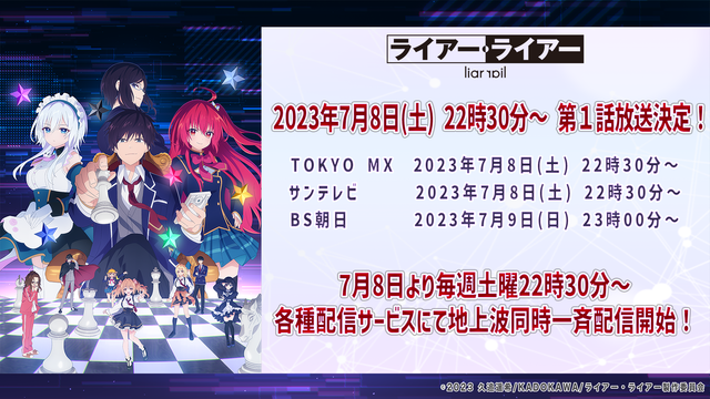 KADOKAWAのライトノベルレーベル「MF文庫J」より大人気刊行中の、絶対に負けられない学園頭脳ゲーム&ラブコメ原作TVアニメ『ライアー・ライアー』が2023年7月8日(土)22時30分よりTOKYO MX、サンテレビにて放送開始が決定。BS朝日では2023年7月9日(日)23時00分より放送が決定した。