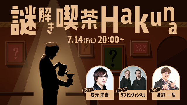「謎解き喫茶Hakuna」は、ライブ配信アプリHakuna内で開催される、1日限定のリアルタイム謎解き生配信イベント。配信に参加すると、お客様として訪れたYouTuberサワヤンの2人と一緒に、声優・安元洋貴演じるマスターが出題する謎解きを体験することができる。またMCキャストとして、謎解きクリエイターの渡辺一弘も出演。参加費は無料で配信日時は7月14日(金)20時からを予定している。
