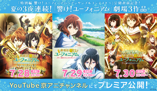 8月4日(金)より劇場上映される『特別編 響け!ユーフォニアム~アンサンブルコンテスト~』の先行カットが公開。また上映を記念して、過去の劇場作品3作がYouTube京アニチャンネルにて期間限定公開されることが発表された。
