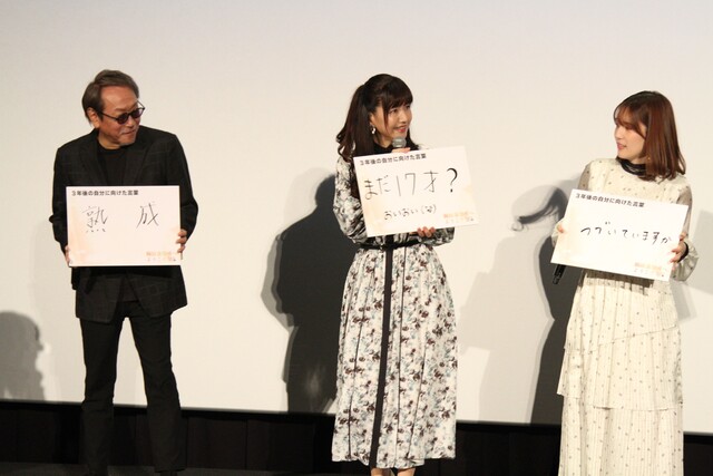 と前向きな気持ちを表した言葉を綴り、そのほか細谷「止まるんじゃねえぞ。」や、井上「まだ17才?」、そして趣味に没頭する中村による「まだ子供部屋ですか?」など個性的な回答で会場の笑いを誘いました。