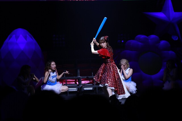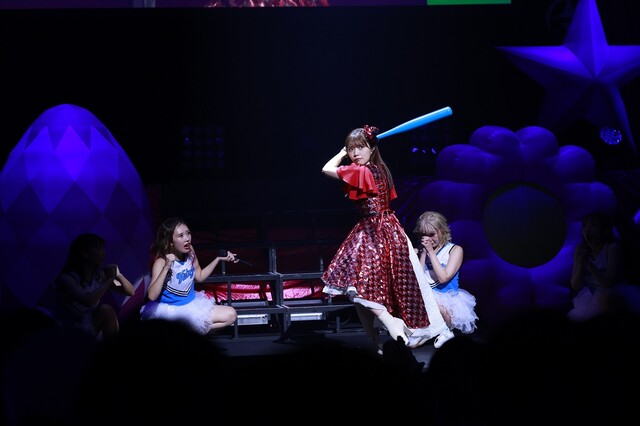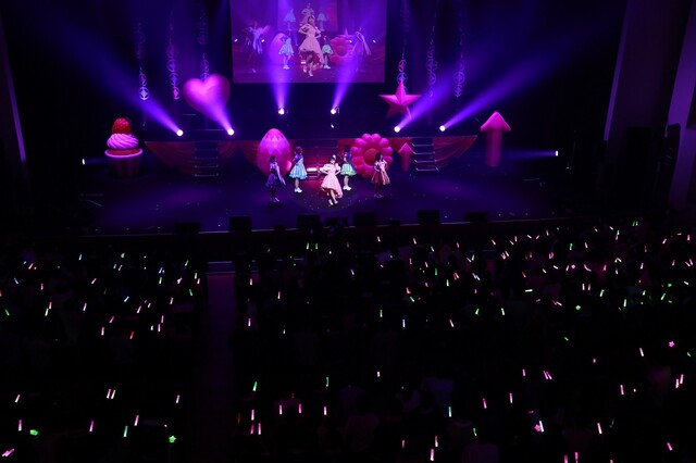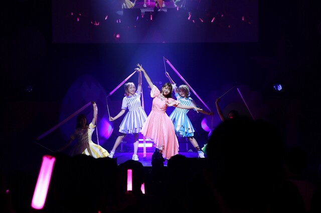 会場となった なかのZERO のステージ上には、カップケーキや卵などのカラフルなオブジェが並び、開演前からお祭りのようなワクワクとした雰囲気が会場を包み込む。開演を迎えると、同時に会場には小気味の良いゴージャスなインストが鳴り響き、ポップなサウンドに合わせて客席のファン=ミモリアンも手拍子で応えていく。会場全体のテンションが上昇していくなか、インストはハッピーハードコア調のハイパーなサウンドへと様変わり。次の瞬間、ステージ中央にピンクのドレスを身に纏った三森すずこが登場。そのまま「PINK♡BABY♡KISS♡」の最初のフレーズを歌い始める。”君にキュンが届きますように”と三森が歌ったあとには、ミモリアンも一緒になって”are you ready?”の大合唱だ。10周年記念ソングをライブの観客と共に歌い、祝う。まさにアニバーサリーライブにぴったりの幕開けである。テンポの速いビートに乗せてポップでキュートな三森が歌っていくと、ステージ奥からは色とりどりの衣装を身に纏ったダンサーたちがやって来て、ステージ上がカラフルに彩られたなかで、サビでは細かい手の動きがシンクロしたダンスを見せていく。キラキラと眩しいステージ上で、テクニカルなパフォーマンスを展開する一方で、その中心にいる三森の表情がそれ以上にキラキラとした笑顔に満ち溢れていたのが印象的だった。