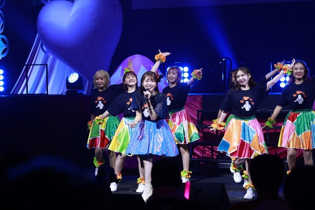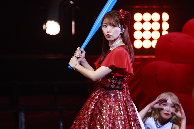 アコースティックセットのあとは、またしても会場の雰囲気が激変し、アグレッシブなEDMサウンドのなかで、みもりんダンサーズたちが激しいダンスを展開する。ふたたび会場のボルテージが上昇していくなかで、次の曲、あるいは次のみもりんの衣装は……?とステージ上に注目が集まるなか、「みんなでイエー☆オーッ!!」のサウンドとともに、赤い衣装の三森が1階客席の後方から登場。もちろん手にはタオルが握られている。ラテンのリズムに乗せてタオルを振り回せば、観客も同じくタオルを手に”イエー☆オーッ!!”の大合唱だ。序盤ですでに観客の歓声やコール&レスポンスは存分に聴かれていたと思っていたが、ここからのブロックはそれにも増してすさまじく、まさに大歓声のなか客席を練り歩くみもりんという、お祭り騒ぎな光景が見られた。そしてステージ上に戻ってきたあとは、そのまま「純情 Da DanDan」のイントロが鳴らされると、これにも客席からとてつもない大歓声が響く。そしてステージ上の三森はおなじみのハットを被り、ダンサーと共に椅子を使ったパフォーマンスを見せるという、初期から見られたみもりんらしいステージが展開されていく。