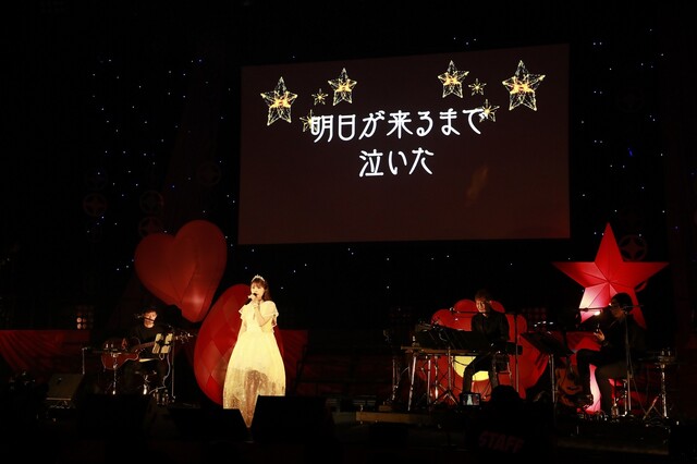 次のMCでは”バンドメンバーに聞きたい三森すずこの思い出コーナー”と称し、突如メンバーにこれまでの思い出を聞く三森。そんなほっこりとしたムードのなかで鳴らされたのは、彼女の代表曲のひとつ「エガオノキミヘ」。ピアノ主体のアレンジで、より三森のボーカルが美しく、そして優しく響く名演となった。そしてこのブロック最後には、「アコースティックの最後は、みんなと私の”これから”に向けて、この曲を歌いたいなと思います」と告げて、『RPB』に収録された新録曲「鈴がなる日」が鳴らされる。彼女が「みんなと私」と表明した通り、会場はステージと客席を繋ぐように明るく照らされる。そのなかで10年を迎えた喜びを歌い上げる姿は実に感動的で、彼女のミモリアンへの優しい想いも伝わる素晴らしいパフォーマンスとなった。