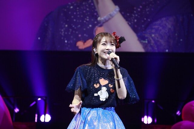 MCで「”RingRing PikaPika BangBang”楽しんでくれたかな?」と問い掛ければ、満場一致の大歓声が返ってくる。「今年は10周年イヤーということで、今日はとっても楽しみにしていました。それはみんなも一緒だと思うけど! ねー!?」と喜びを伝えた。あとは、告知や写真撮影を挟み、「まだまだ続いていく三森すずこのアーティスト活動、これからもよろしくお願いします」と改めて今後に向けての意気込みを語った。そして「次はみんなに伝えたい、みんなのための曲です!」と言えば、観客も待っていましたと大歓声を送る。鳴らされるのはもちろん「スマイリウム」だ。サビでは観客も一緒に同じ手の振りを見せるこの曲、終盤でも三森が”私とみんなで”と歌い、そのあとの”夜空が創れるなら”と観客が歌う感動的なシーンも含めて、改めて”みんなのための曲”であることを実感する。そしてそこから三森が”歌い続けるよ”と歌うお馴染みの流れだが、それが10周年というタイミングで歌われることにさらなる意味を感じさせるようで、グッと胸に迫るような瞬間でもあった。
