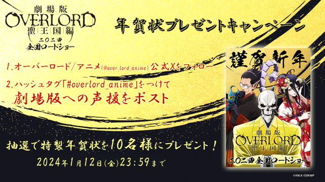 新春特別番組で公開された新規ビジュアルに描かれていたのはお正月らしいゴージャスな和装姿のアインズ、アルベド、デミウルゴスの3キャラクター。こちらのイラストを使用した年賀状プレゼントキャンペーンもアニメ「オーバーロード」公式 X にて実施中。ハッシュタグ「#overlord_anime」をつけて劇場版への声援をポストすると、抽選で10名に特製年賀状をプレゼント。