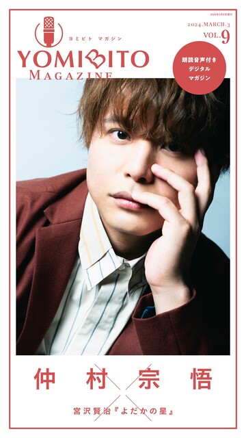 3月8日配信の最新号(vol.9)では、『THE FIRST SLAM DUNK』宮城リョータ役や『アイドルマスター SideM』天道輝役などで人気の仲村宗悟が、宮沢賢治の『よだかの星』を朗読。主人公「よだか」の姿が自身の少年時代とも重なるというこの名作を熱演。約19分の朗読音声のほか、撮り下ろし写真やロングインタビュー、朗読後の感想や聴きどころなどを語った動画メッセージも収録。声優・仲村宗悟の魅力がたっぷり詰まった一冊となっている。