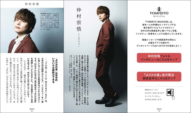 「YOMIBITO MAGAZINE」は2023年7月にスタートした新シリーズで、朗読音声に撮り下ろし写真やロングインタビュー、動画メッセージなどをプラスしたボイス&フォトマガジンで、今作「vol.9~仲村宗悟」が9作目となる。
