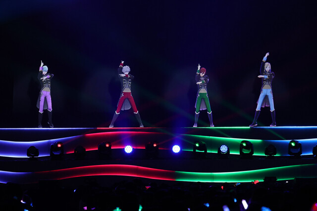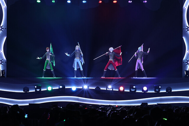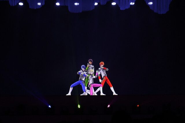 続いてはQUARTET NIGHTのターンへ。各メンバーのソロタイムでは、寿 嶺二の「Hurray×2ドリーマーズ」、黒崎蘭丸の「No.1」、カミュの「Double face」、美風 藍の「ムネノコドウ」の4曲を披露。夜公演では、歌い終えた4人がそれぞれの楽曲について話に花を咲かせた。嶺二がメンバーに、ハッピーな気分になれるという自身の曲の振り付けを「みんなもやってくれていいんだよ?」と提案するものの、蘭丸、藍、カミュの3人は同時に首を振る。嶺二が「振ってほしいのは首じゃないのに! いけず!」と返すと、その微笑ましい様子に会場から大きな笑いが起こった。そして、この4人でしか奏でられない最高の1曲として「Starlight Memory」を熱唱、フラッグを手にした力強いパフォーマンスで魅せた。