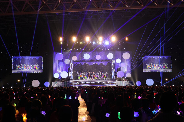 挨拶代わりの3曲を終え、あらためて出演者全員がステージに集まる。観客はメンバーひとりひとりの名前をコールし、アイドルたちはそれぞれのグループポーズを決めた。今回のライブはサブタイトルのとおり、『音楽で紡ぐ宇宙』がテーマだという。ST☆RISHの一十木音也が「俺たちだけじゃなくて、ここにいるみんなも宇宙の星の1つだからね!」と声をかけると、ファンは歓声とペンライトの明かりでそれに応えた。すると、HE★VENSの鳳 瑛一は「なんて素晴らしい光景なんだ!」と喜びの表情を見せ、QUARTET NIGHTの寿 嶺二が「それじゃあ、みんなでキラキラの宇宙をつくっちゃおうか!」と観客を誘う。そして、会場一体となっての声出しの後、ライブは次の展開へ。