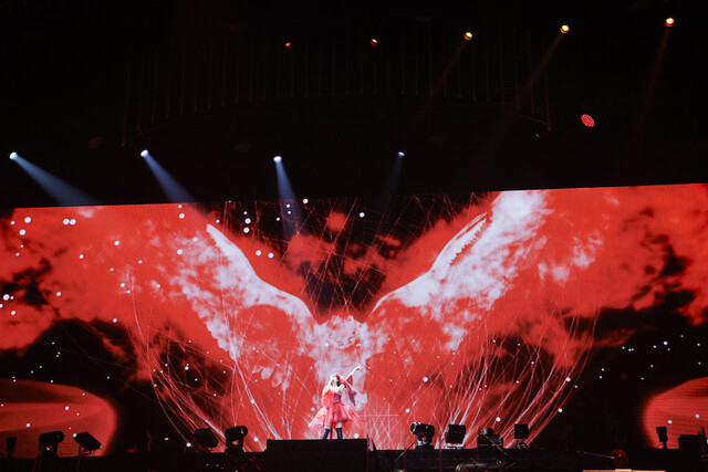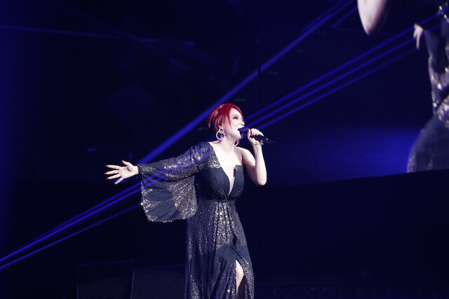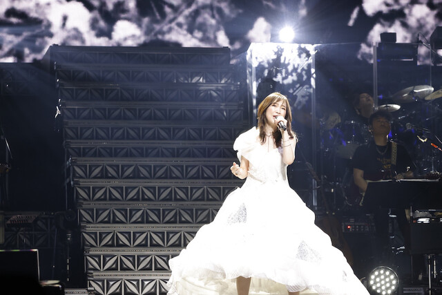 「残酷な天使のテーゼ」を歌いながら、上空からゴンドラに乗って登場した高橋洋子は、白の衣装も相まってまるで女神が降臨した様。ダンサーを従えてのステージは圧倒的な迫力で、進化を続ける高橋のステージに会場が大歓声で沸く。「こんばんは。angelaのKATSUです」と挨拶するなどお茶目なMCでも会場を沸かせた。
