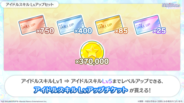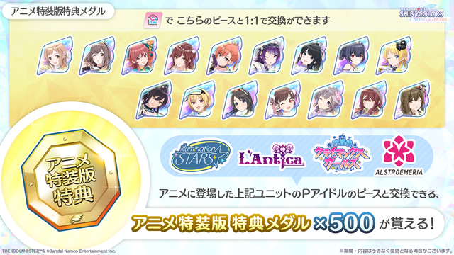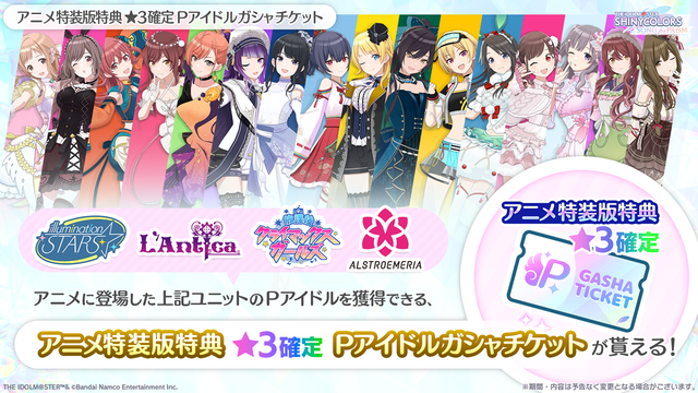 特典シリアルコードでは、「アニメ特装版特典P-SSRアイドルセレチケV 1枚」や「描き下ろしS-SRアイドルカード 4種類」その他、ゲーム内アイテムなど豪華アイテムが獲得できる。