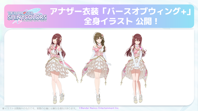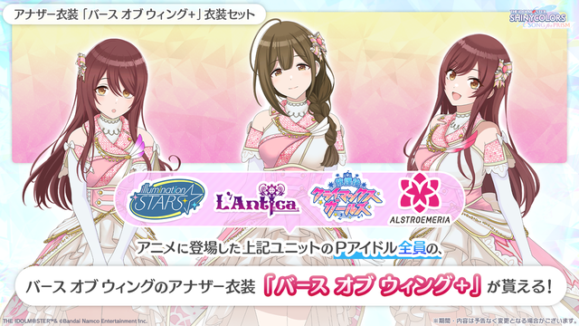 特典シリアルコードでは、16人分のアナザー衣装「バース オブ ウィング+」のほか、「アニメ特装版特典★3確定Pアイドルガシャチケット」や、ゲーム内アイテムなどが獲得できる。