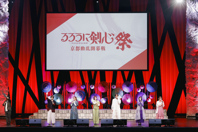 カラフルな和傘に飾られた華やかなステージにキャストが登場すると、会場は盛大な拍手に包まれ、斉藤「どうも皆さんこんばんは~!本日は楽しんでいきましょう!」、高橋「るろ剣の単独イベントということで楽しみです!」、小市「本日はよろしくお願いします!」、八代「外の暑さに負けないくらい、アツいアツいイベントになると思います!」、大西「るろ剣のイベントに参加するのが初めてなので、たくさんるろ剣愛を語っていきたいと思います!」と意気込み、イベントはスタート。