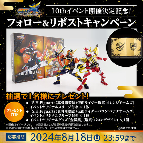 イベント公式X(旧Twitter)アカウントをフォローし、対象のキャンペーンポストをリポストすると抽選で1名に、オリジナルスリーブ付きの「S.H.Figuarts(真骨彫製法)仮面ライダー鎧武 オレンジアームズ」「S.H.Figuarts(真骨彫製法)仮面ライダーバロン バナナアームズ」と、オリジナルグッズで販売する「金屏風」のセットが当たる。