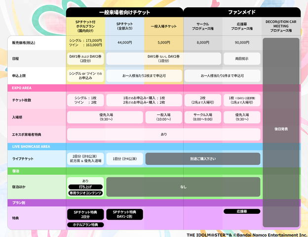 各種チケットのお申し込み7月26日(金)21:00から開始。アイマスエキスポでは多くのチケットの種類やプロデュース権がございます。