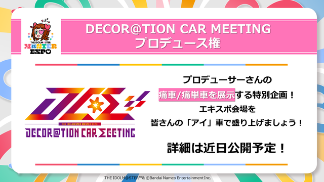 「THE IDOLM@STER M@STER EXPO」内にて、プロデューサーさん達の痛車/痛単車を展示する企画「DECOR@TION CAR MEETING」を開催いたします。申込方法等詳細は後日発表いたします。