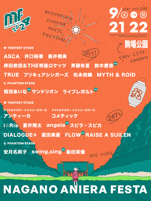 翌日DAY2には、音楽×コミックで描く新感覚キャラクタープロジェクト「swing,sing」、これまで数多くのアニメ作品を楽曲で彩ってきた「FLOW」が2度目の出演が決定。そして今回で3度目の出演となり、昨年は大トリも務めた「angela」の出演が決定し、ナガノアニエラフェスタ2024をさらに盛り上げる。