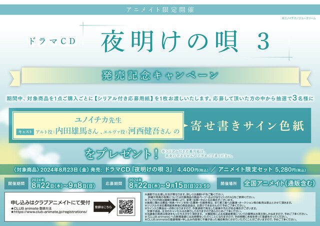 各法人特典の画像も公開された。本作は本編を収録したCD2枚組の通常盤に加え、コミックス『夜明けの唄 3』に付いたアニメイト特典の20P小冊子を音声化したスペシャルボイスドラマや、キャストトークを収録した「アニメイト限定セット」も同時発売。