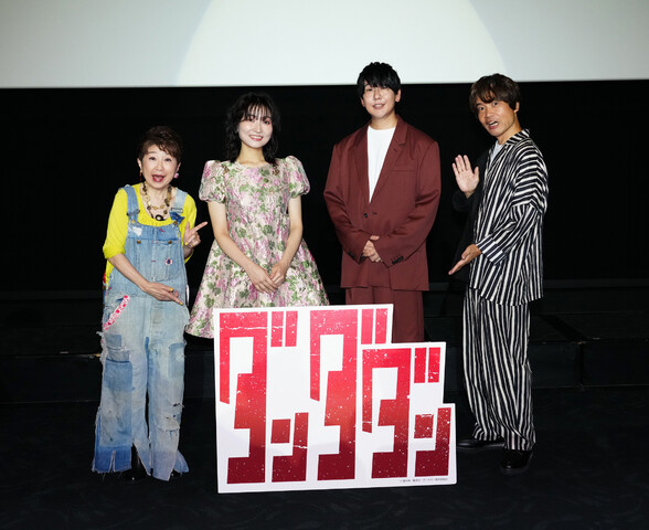 10月3日からMBS/TBS系28局「スーパーアニメイズムTURBO」枠にて全国同時放送開始のTVアニメ『ダンダダン』の大阪先行上映会が21日に実施され、若山詩音(モモ役)、花江夏樹(オカルン役)、田中真弓(ターボババア役)、中井和哉(セルポ星人役)が登壇した。同4人の登壇は、昨年実施された「ジャンプフェスタ2024」以来となり、舞台挨拶が始まると徐々に4人のテンションがヒートアップ。田中が中井に代わって、“セルポ星人”を演じる上で苦労した点や意識した点を語りだすと、今度は中井が田中に代わって“ターボババア”について語るなど、カオスな展開に。ベテラン2人の軽妙なやり取りに若山と花江、そして会場に集まったファンの爆笑に次ぐ爆笑の舞台挨拶となった。